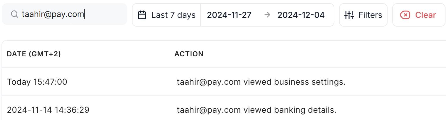 - Email address: Returns all actions performed by a specific user's email address.